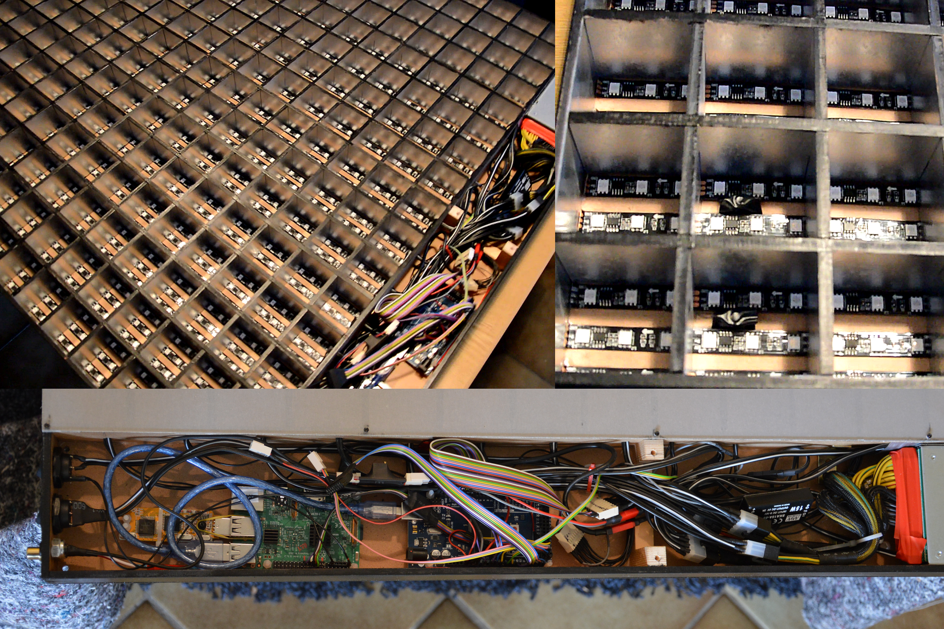 LED-based pixel wall for animations and tetris visualisation. Provides 16×24 RGB pixels on 80x120cm. LEDS are controlled with an Arduino, a Raspi provides input from arbitrary image or stream inputs including showing live Tetris games from NES input.